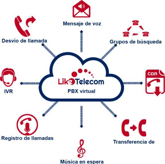 PBX virtual – es una PBX multifuncional, que permite organizar de manera efectiva telefonia de su oficina en tan solo unos minutos. Físicamente PBX se encuentra en los servidores de LikeTelecom (de ahí proviene el segundo nombre “PBX en la nube”), y por lo tanto no requiere la compra de equipo extra y necesidad de gastar en mantenimiento .Lo unico que necesita para utilizar el PBX virtual – es acceso al Internet. PBX virtual LikeTelecom conmuta paquetes a través de la red TCP / IP y está basado en el protocolo SIP (Session Initiation Protocol – Protocolo de Iniciación de Sesión), que nos brinda compatibilidad técnica con la mayoría de los SIP-clientes, para el hardware (telefonía IP) y el software (softphones).