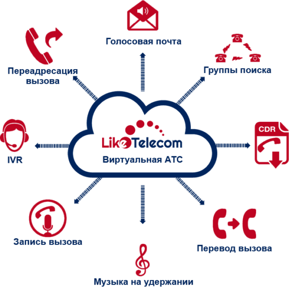 Виртуальная АТС —  это многофункциональная офисная АТС, которая позволит эффективно организовать телефонную связь в Вашем офисе за считанные минуты. Физически АТС размещается на серверах Like Telecom (отсюда второе название «облачная АТС»), поэтому не требует затрат на покупку дополнительного оборудования и содержание технического персонала. Все, что Вам нужно, чтобы пользоваться виртуальной АТС – это доступ к интернету. Облачная АТС Like Telecom коммутирует пакеты в сети TCP/IP и работает на базе протокола SIP (Session Initiation Protocol — протокол установления сеанса), что обеспечивает техническую совместимость с большинством существующих SIP-клиентов как аппаратных (IP-телефоны) так и программных (софтфоны).